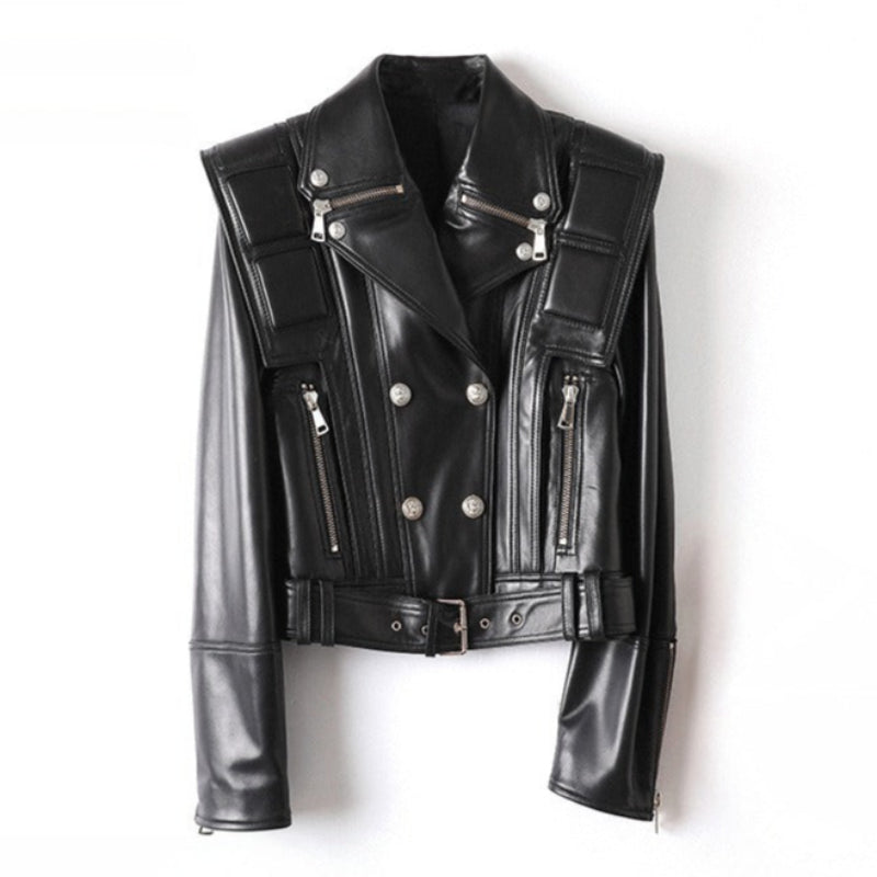 Crafted from genuine sheepskin leather, this jacket is a symphony of texture and detail, featuring an intricate array of zippers and a structured, belted waist. It's a piece of wearable art for the adventurous soul, perfect for adding an avant-garde edge to a flowing dress or a curated ensemble.